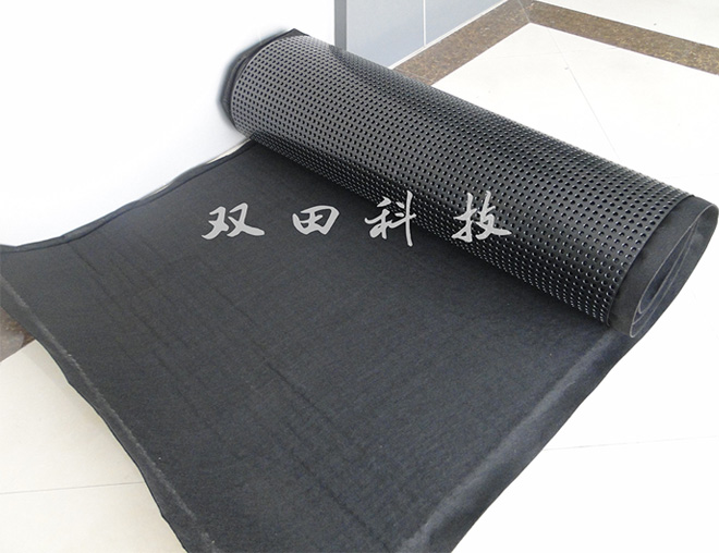 圆锥突台(或中空圆柱形多孔)的塑胶底板,由高抗冲聚苯乙烯(HIPS)制成。圆锥突台(或中空圆柱多孔)的顶面胶接一滤层无纺布,以阻止泥土微粒通过,从而避免通道阻塞,使孔道排水顺畅。