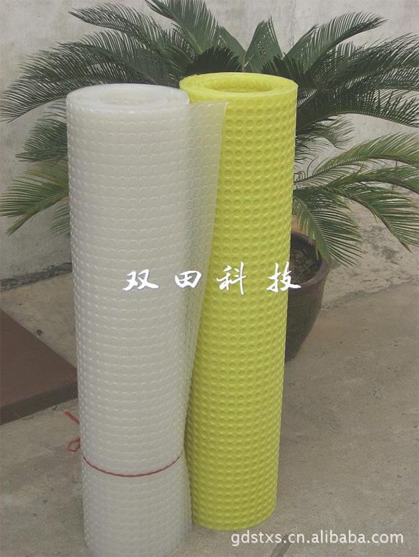 圆锥突台(或中空圆柱形多孔)的塑胶底板,由高抗冲聚苯乙烯(HIPS)制成。圆锥突台(或中空圆柱多孔)的顶面胶接一滤层无纺布,以阻止泥土微粒通过,从而避免通道阻塞,使孔道排水顺畅。
